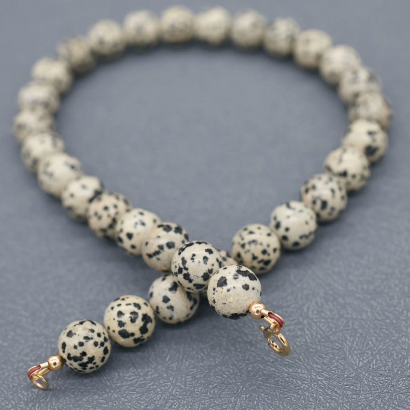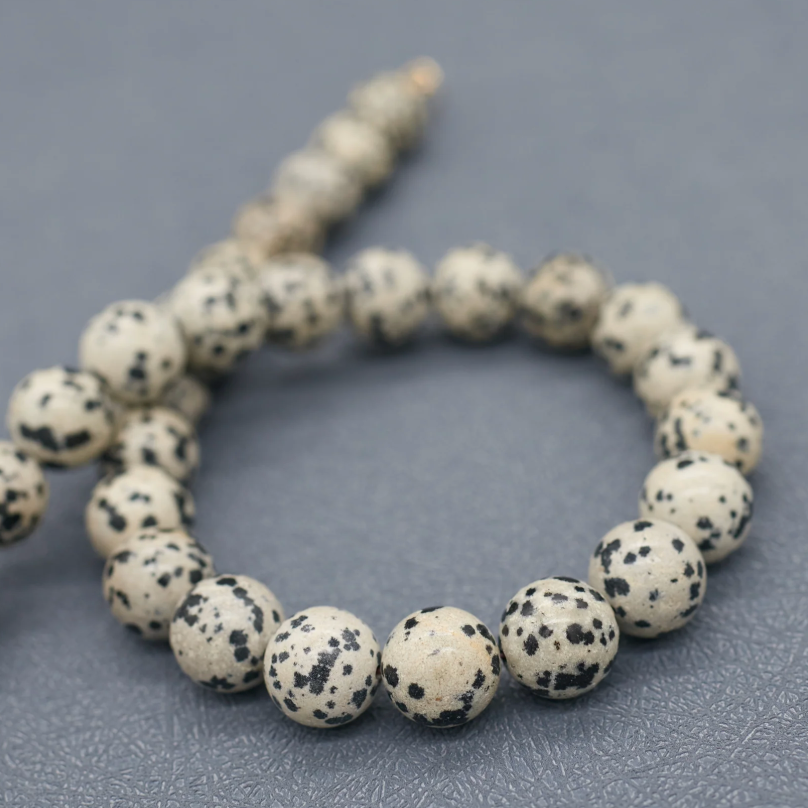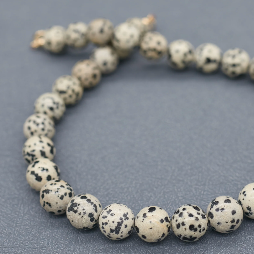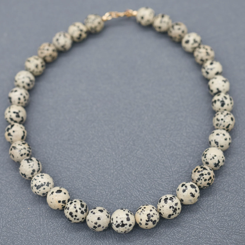 The Fleck Necklace is made from 12mm Dalmatian Jasper beads, each one uniquely speckled with inky black markings across a soft, creamy base. No two beads are the same - giving the piece its organic, almost painterly feel.