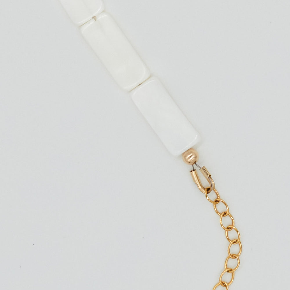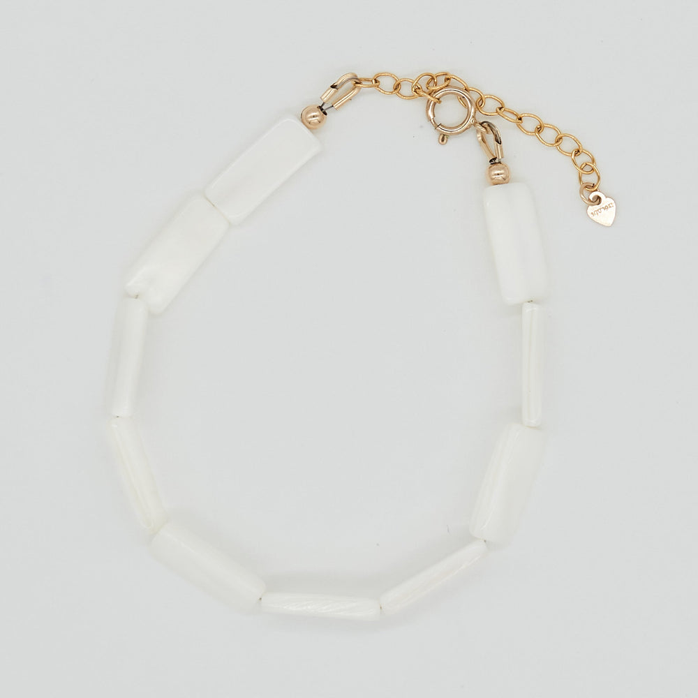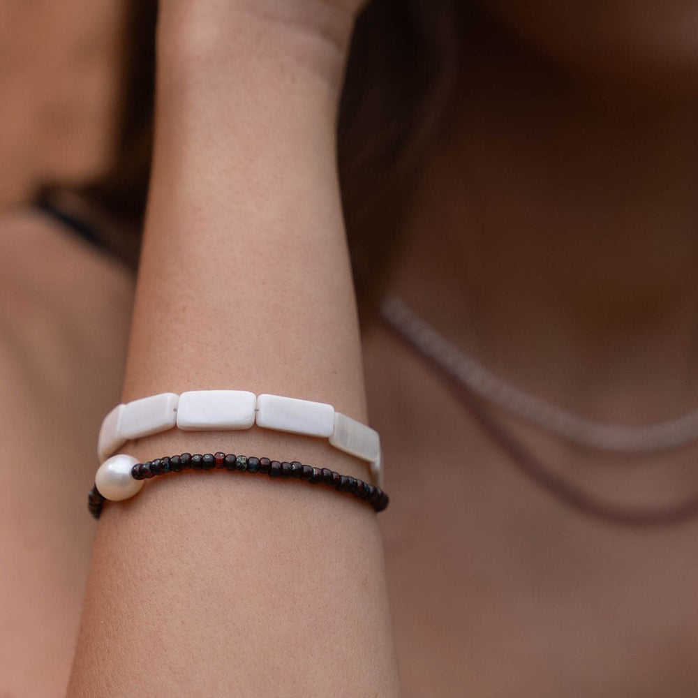 Inspired by coastal wanderings, this handcrafted bracelet features flat rectangular mother of pearl beads that capture the sea's soft, iridescent glow. The stepped design creates a sleek silhouette that transitions effortlessly from casual linen layers to evening gold accents.