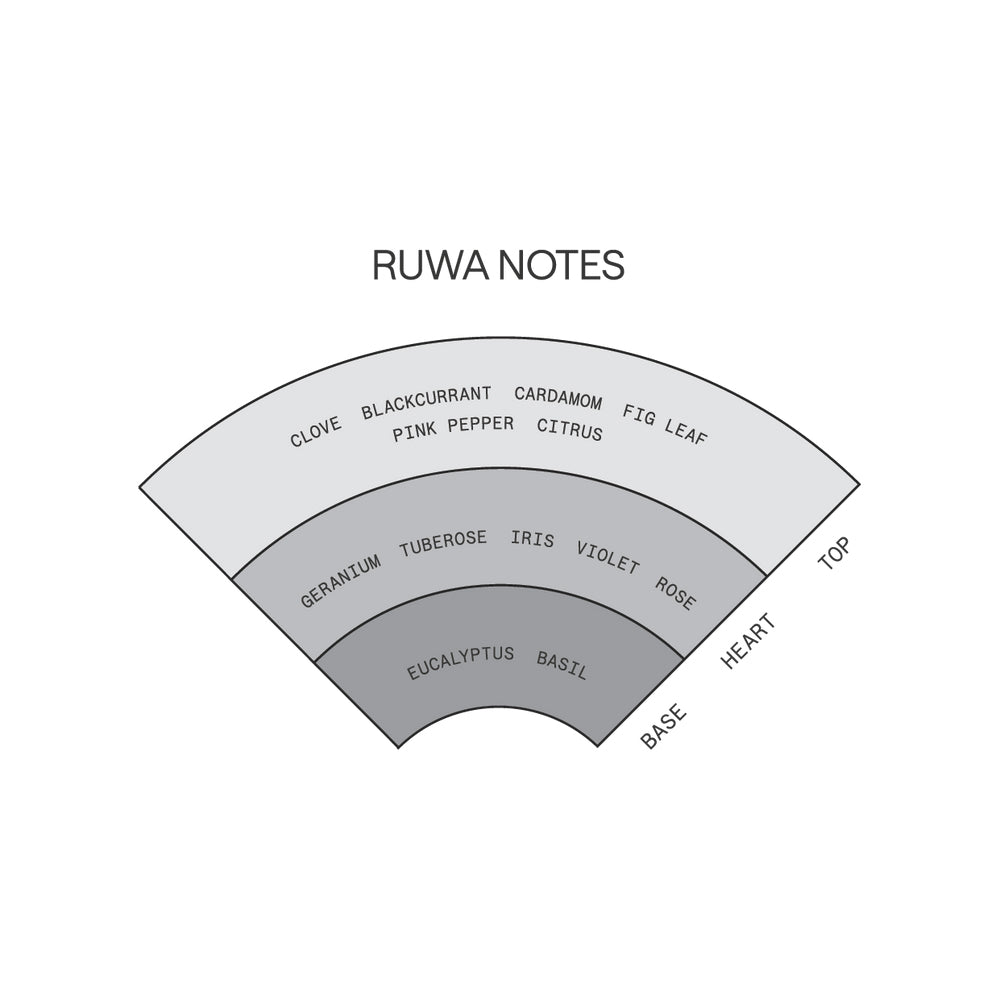 Unexpected yet addictive, RUWA thrives in contrast. A bold base of eucalyptus, basil and clove sets the tone with herbal depth, while top notes of fig leaf, tuberose, citrus and geranium awaken the senses with a luminous freshness. RUWA is a bold contradiction. Spiced yet crisp, fresh yet undeniably intense.