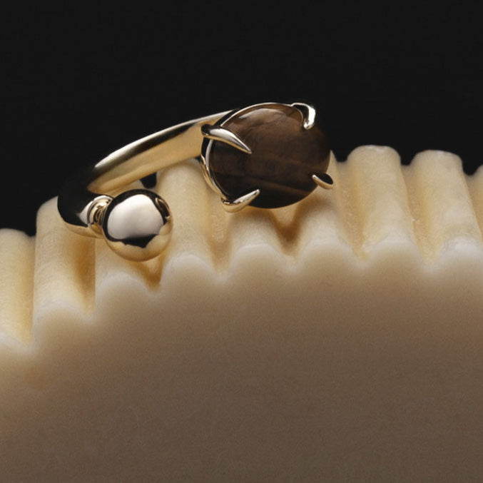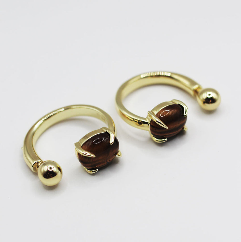 These conceptual earrings are adorned with a cabochon gemstone and an oversized claw setting.