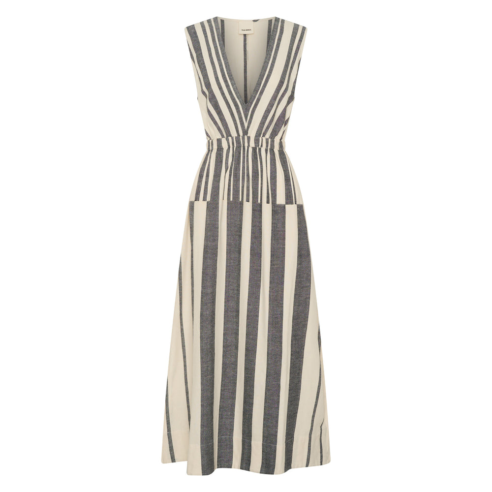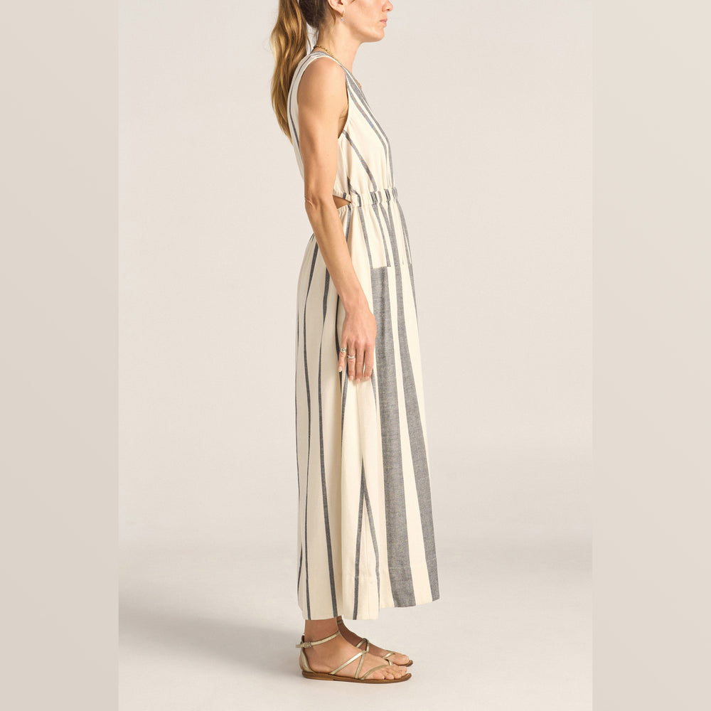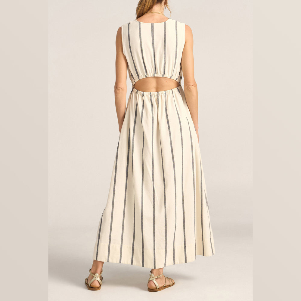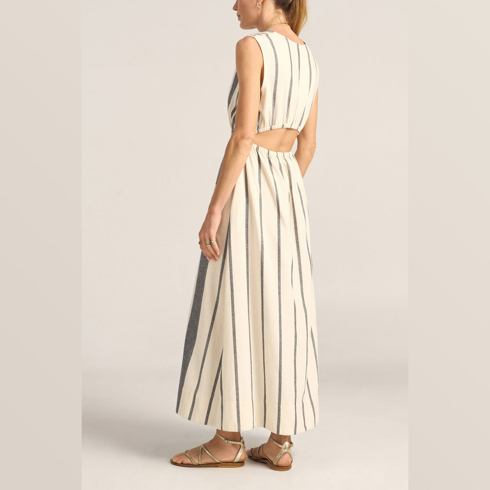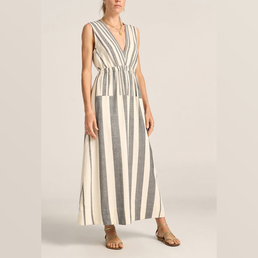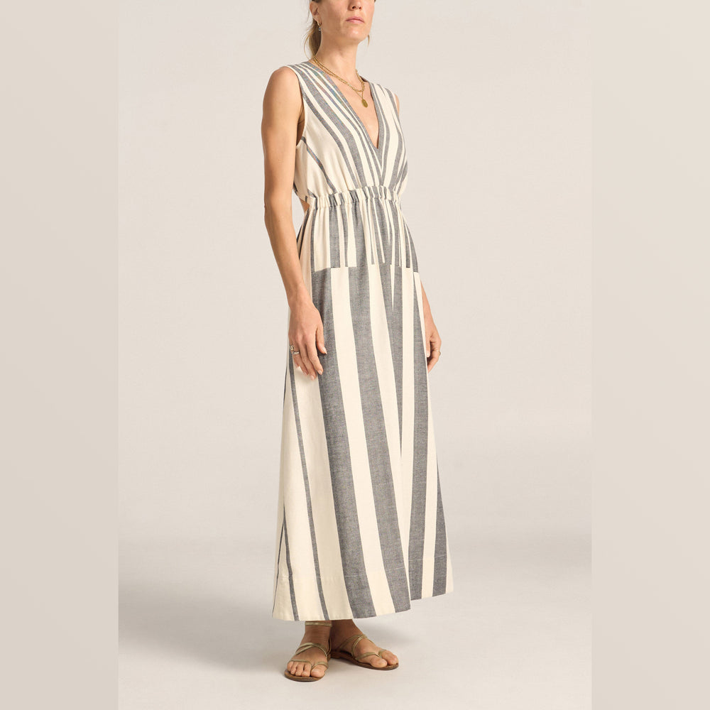 This sleeveless style features a flattering V-neckline, an elasticated waistband that softly cinches the body, and a peek-a-boo detail at the back waist for a touch of skin. Long length, the flowy skirt features side pockets and side slits to allow for ease and movement, making this dress a perfect piece for warm, sun-filled days.