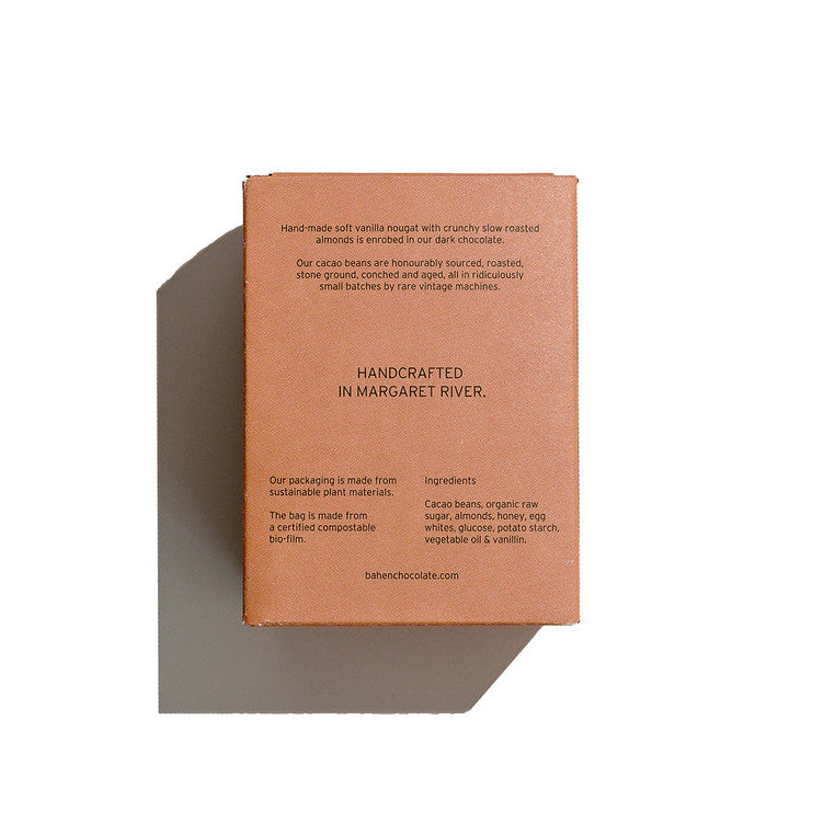 Hand-made soft vanilla nougat with crunchy slow-roasted almonds is enrobed in dark chocolate.